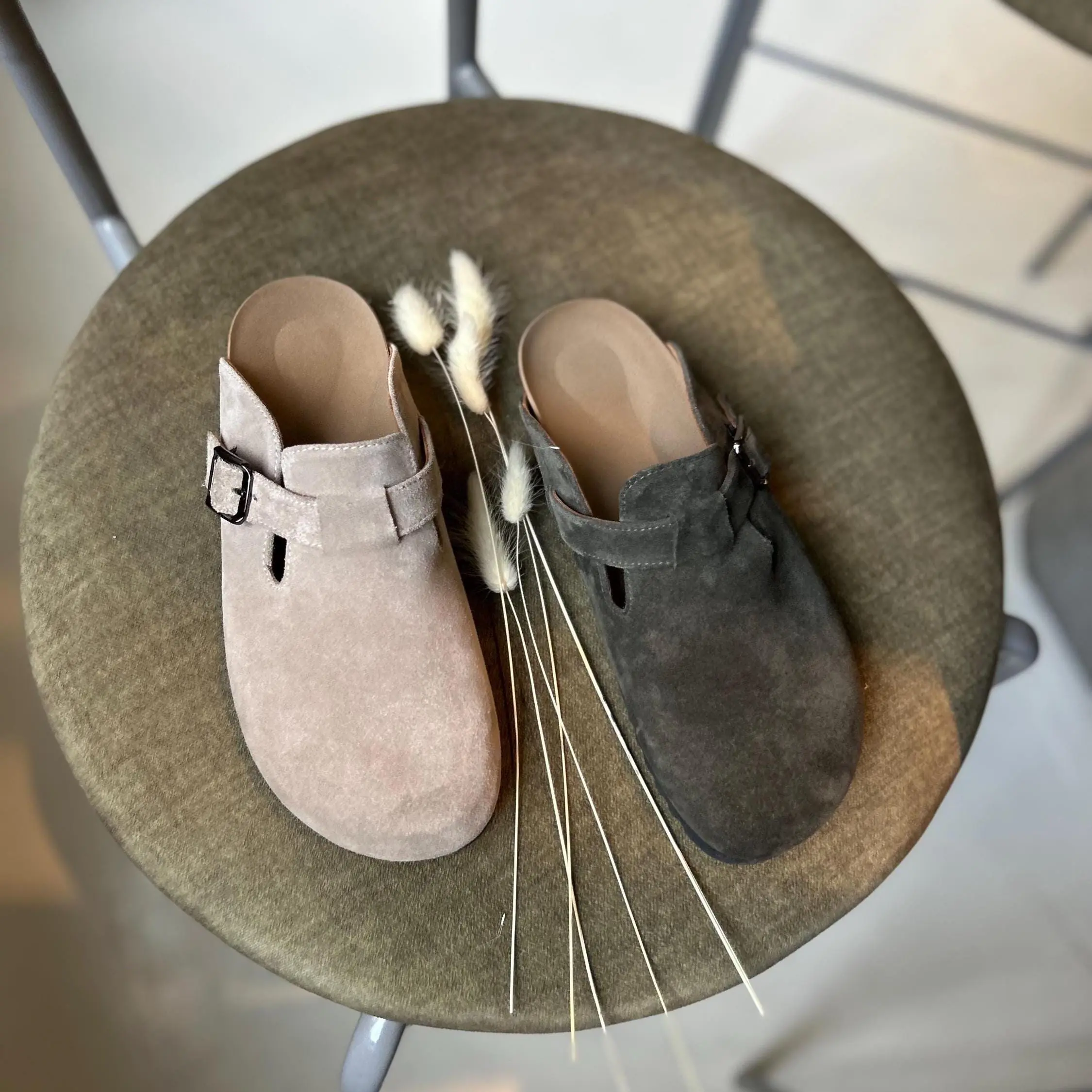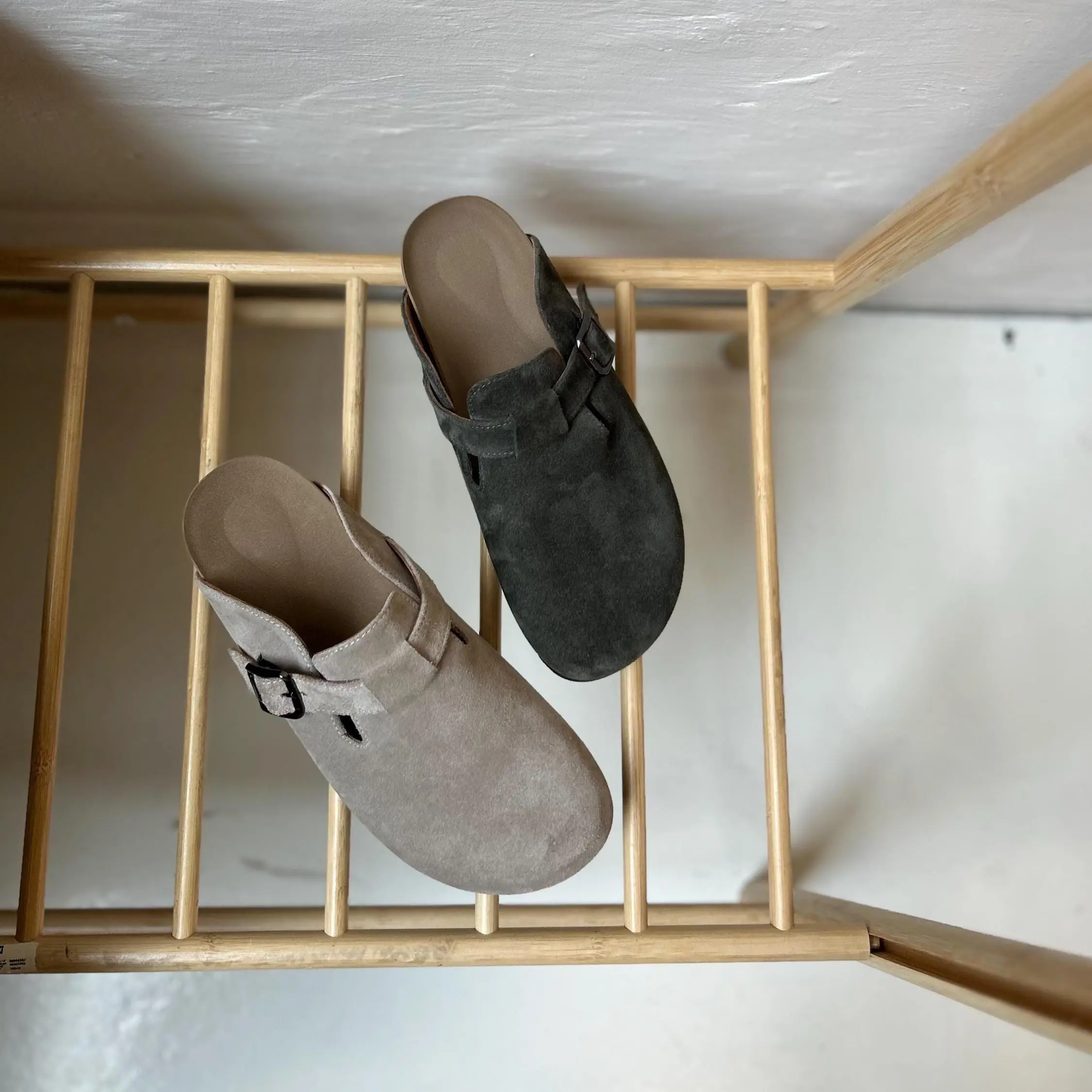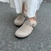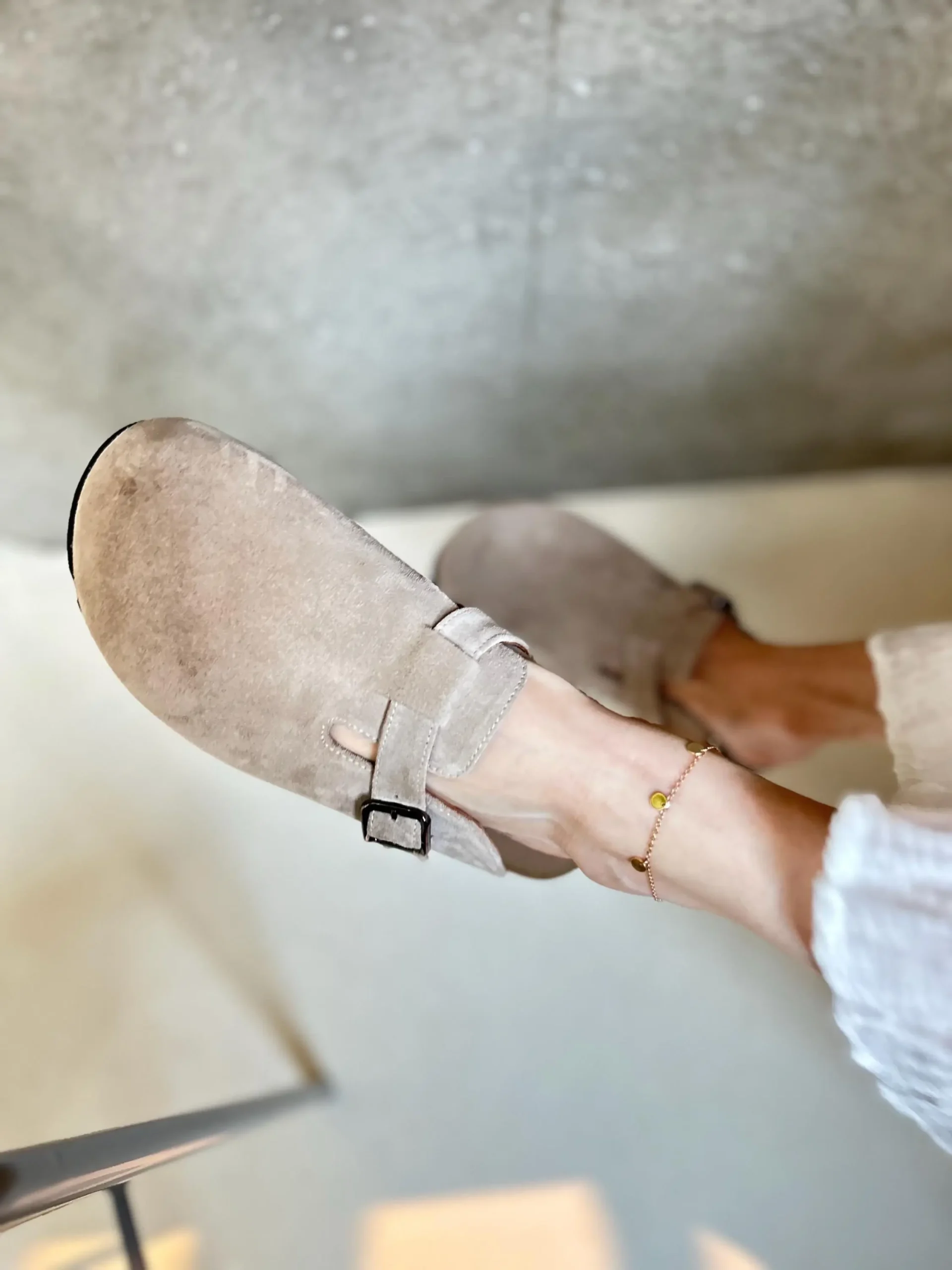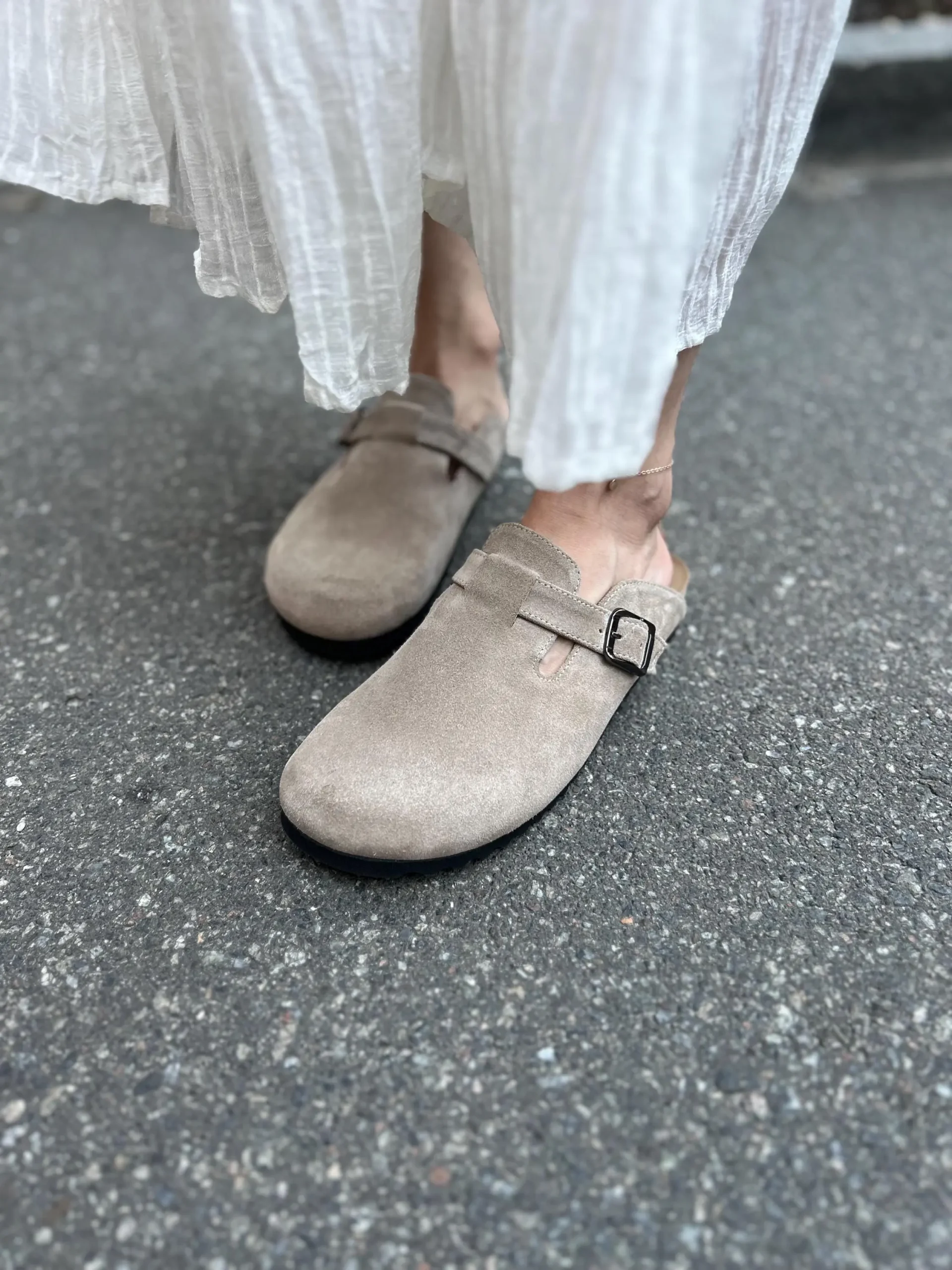 Beige Suede Clogs: Summer Mules with Adjustable Buckle