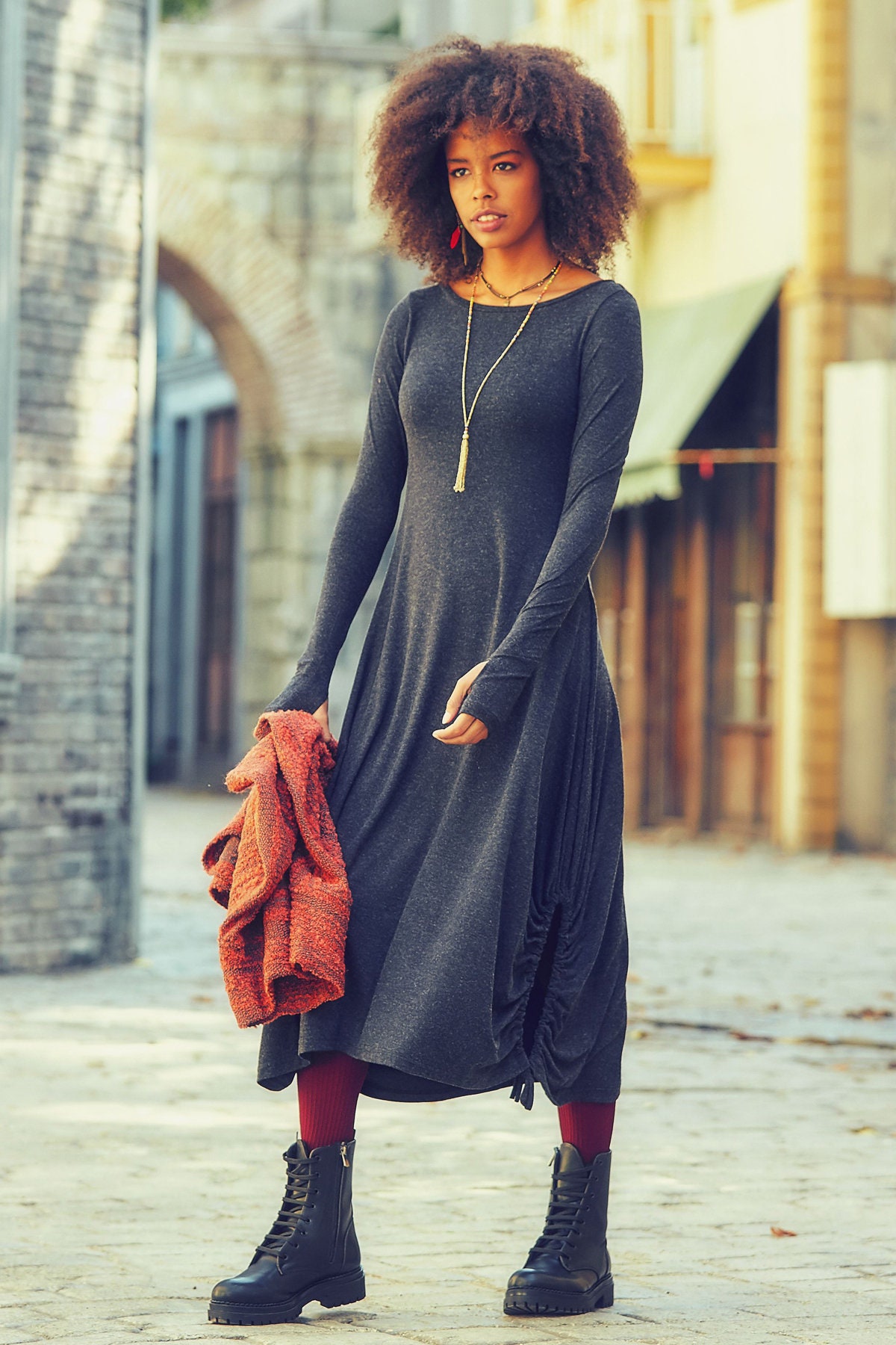 It is a long length and long sleeve dress with very light cozy fabric.