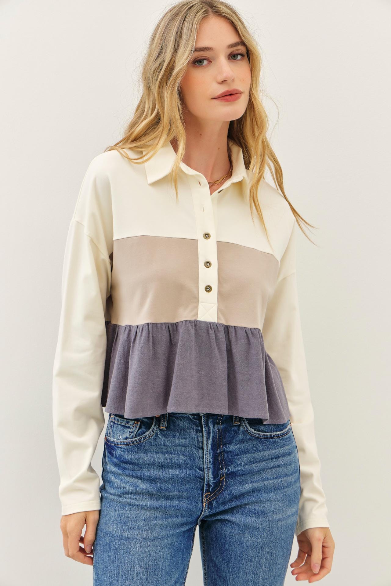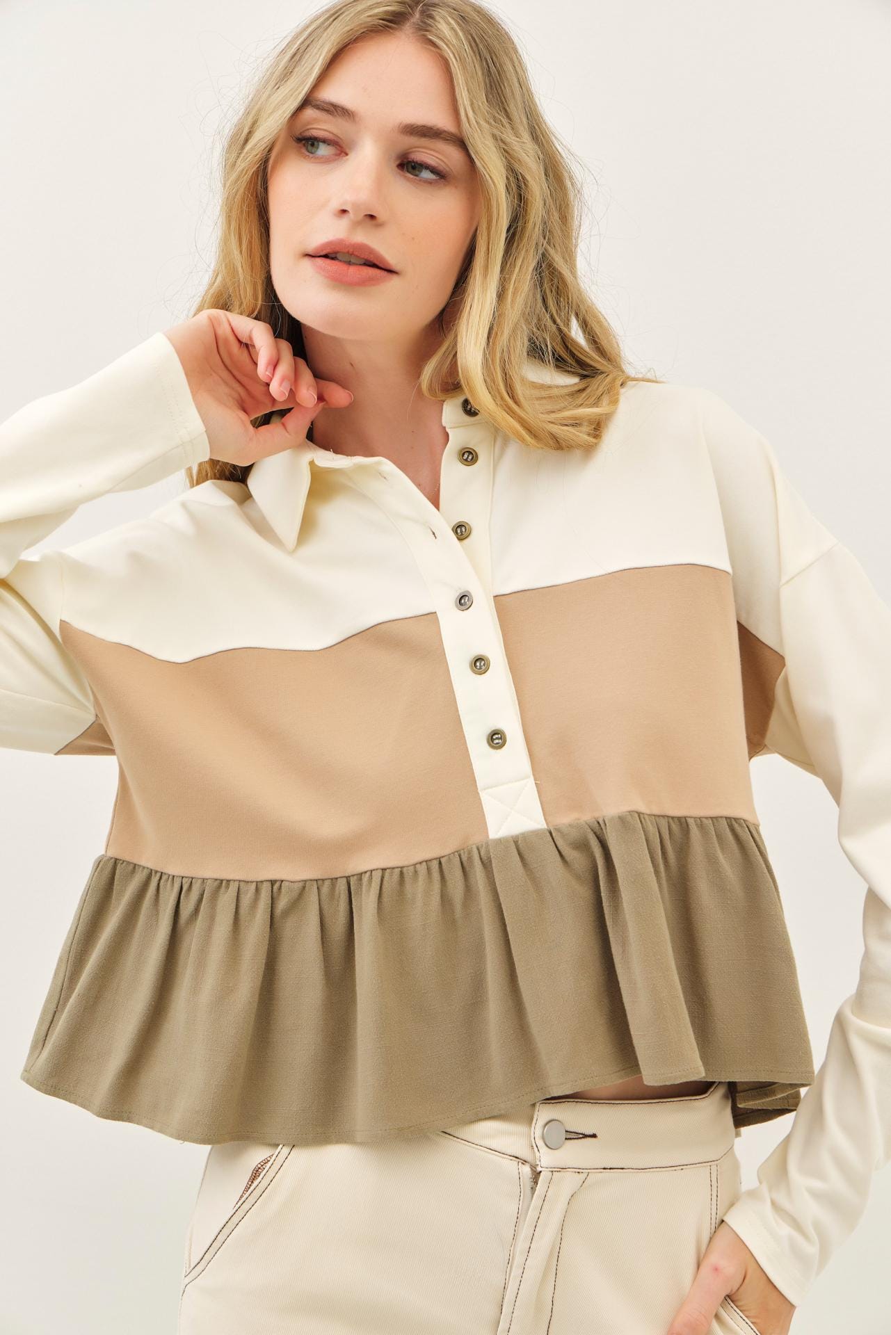 Designed with a gently flared fit, layered ruffle detail, and a relaxed half button-down neckline, it’s the perfect blend of casual and elevated. Whether you’re dressing it down with jeans or styling it with boots and accessories, this top adds effortless texture and charm to your day.