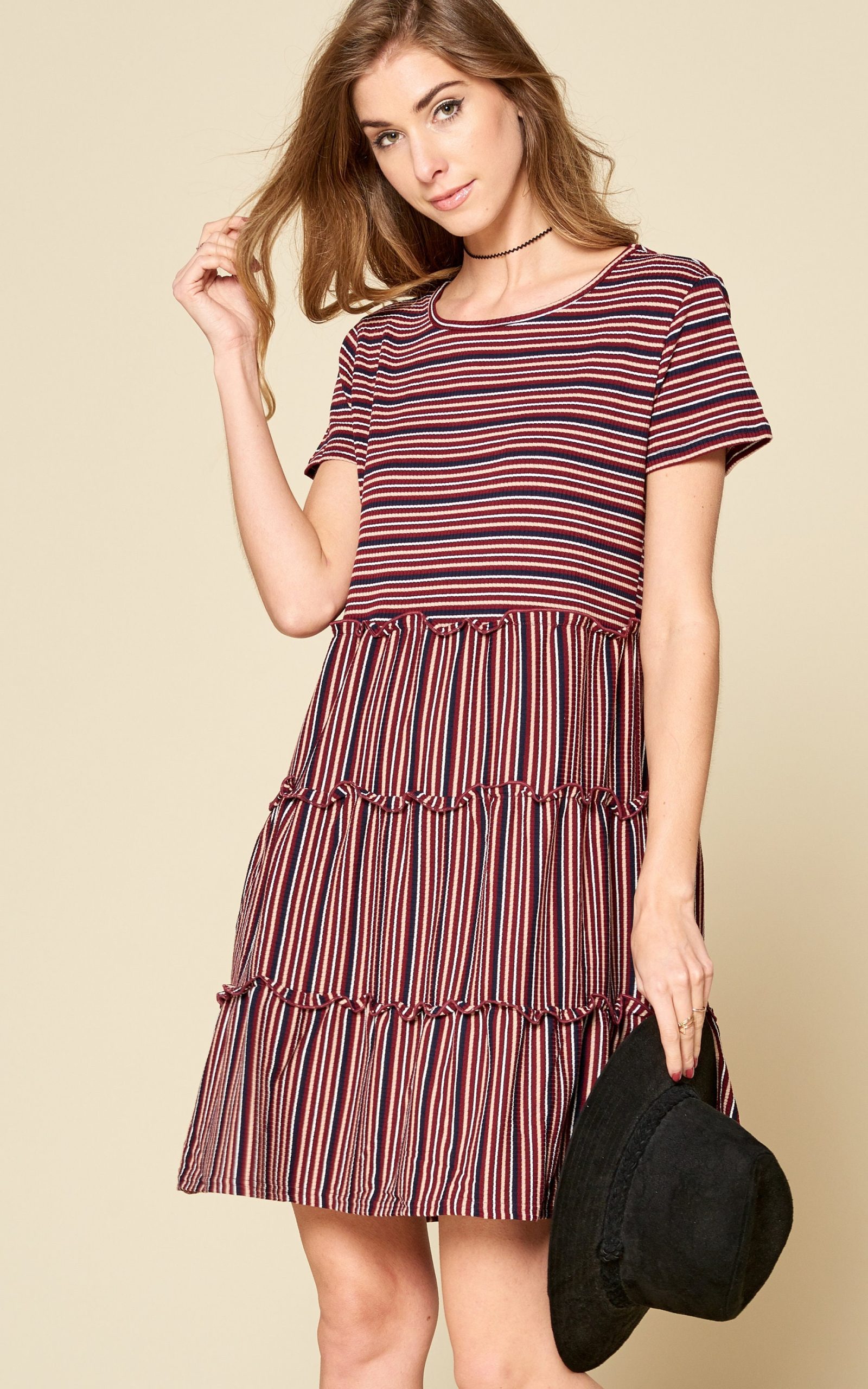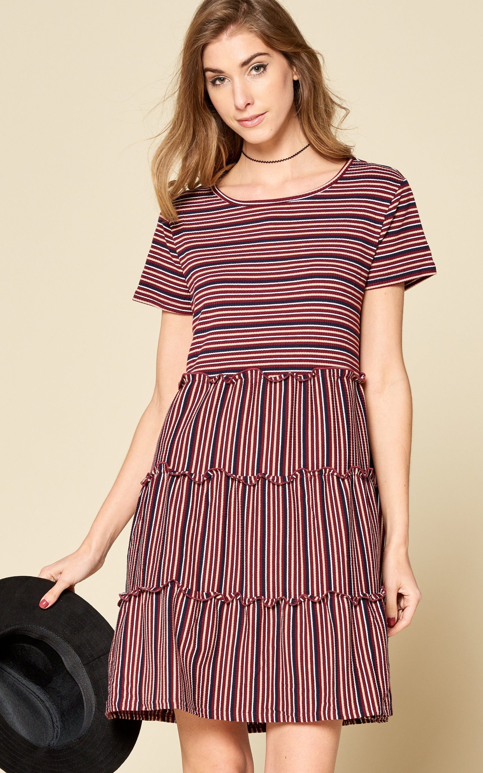 Stretchy Stripe Mini Dress: Ribbed Knit Round Neck