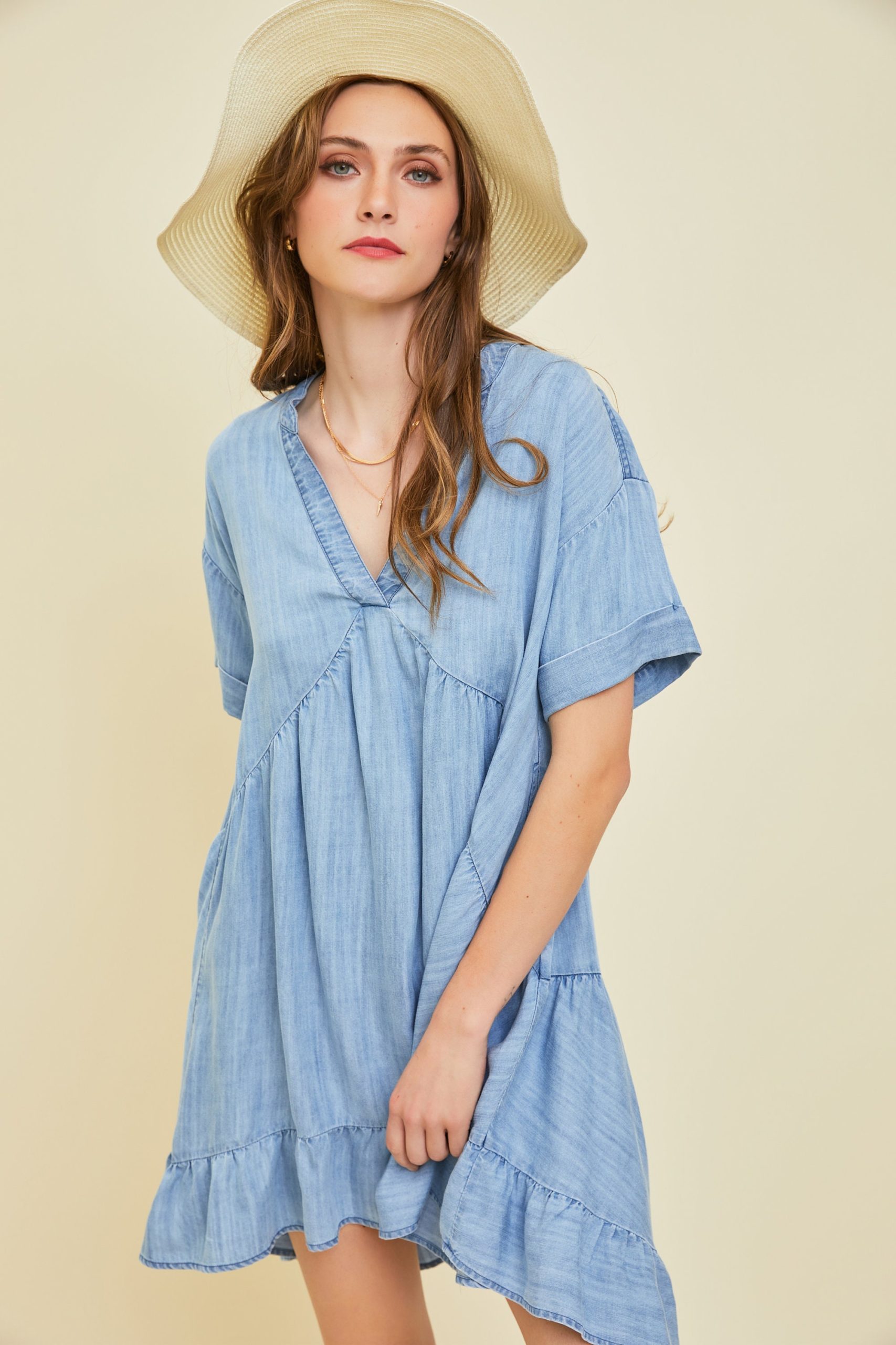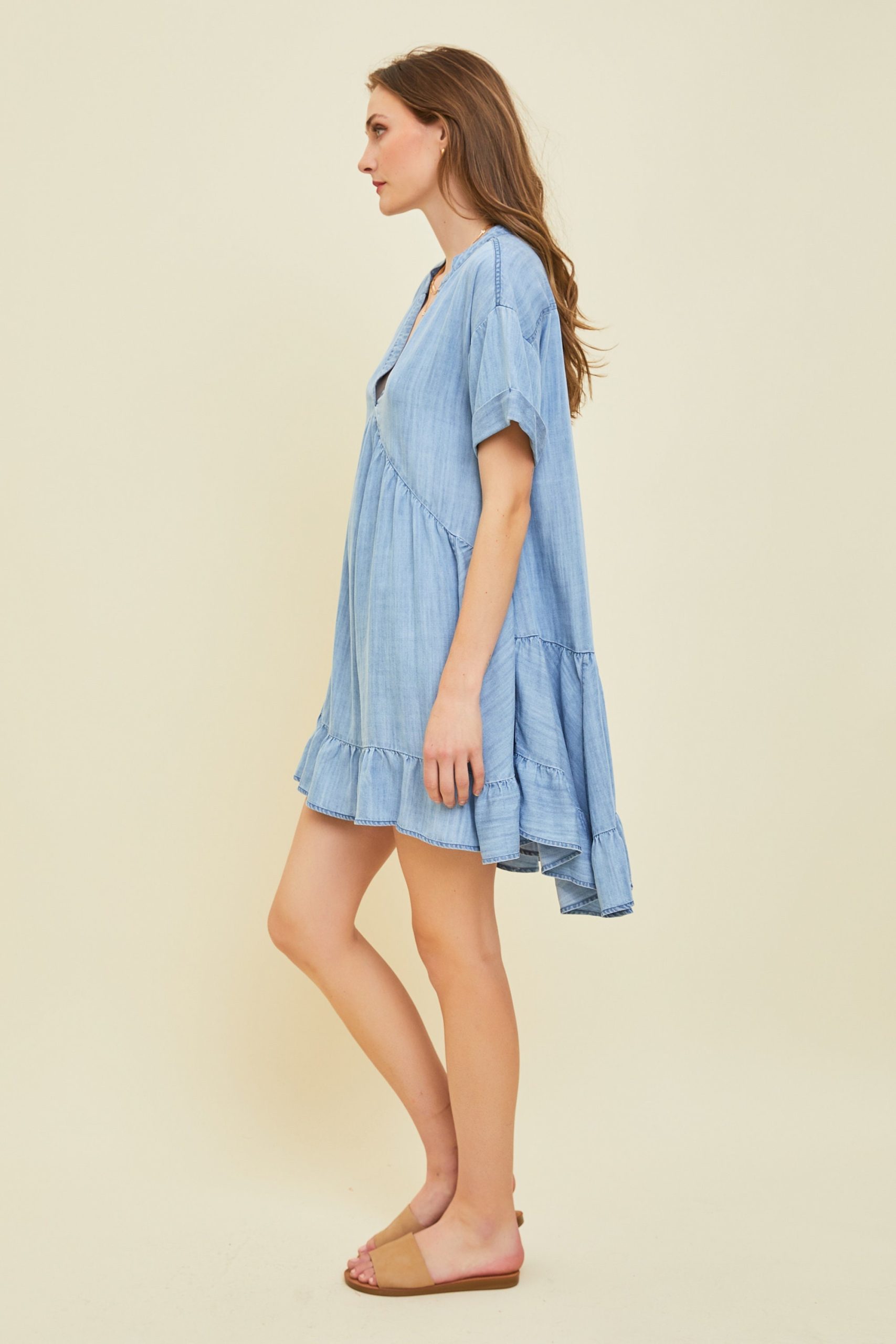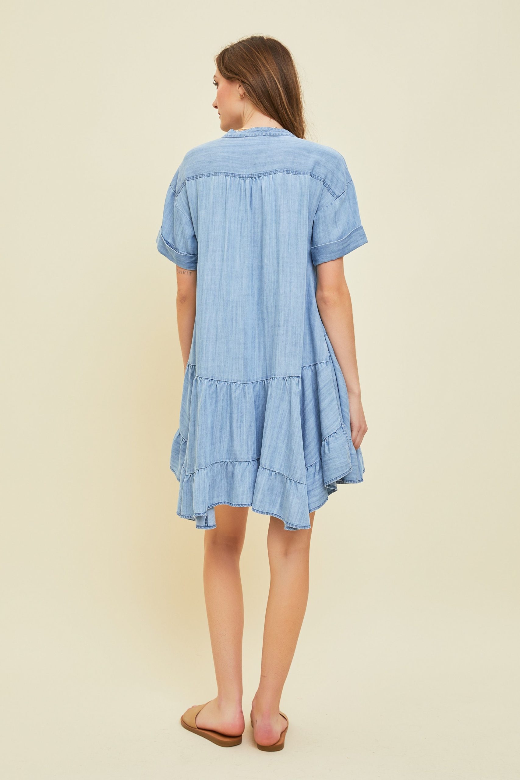 Washed Denim Chambray Mini Dress Flowy A Line