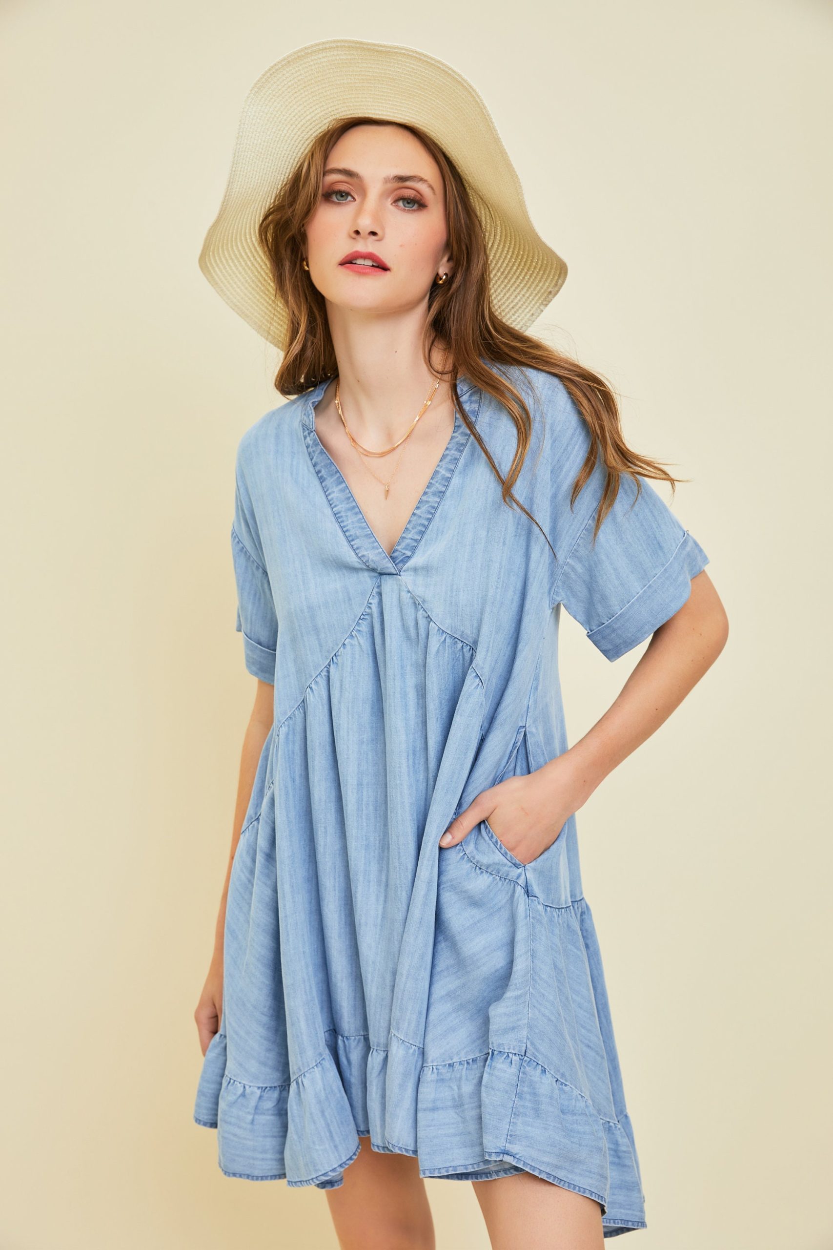Say hello to your new favorite daily dress. This flowy, washed denim mini dress is made from soft, high-quality chambray that feels as good as it looks. Designed with a flattering loose fit, subtle flare, and functional side pockets, it’s perfect for everything from coffee runs to casual office days.