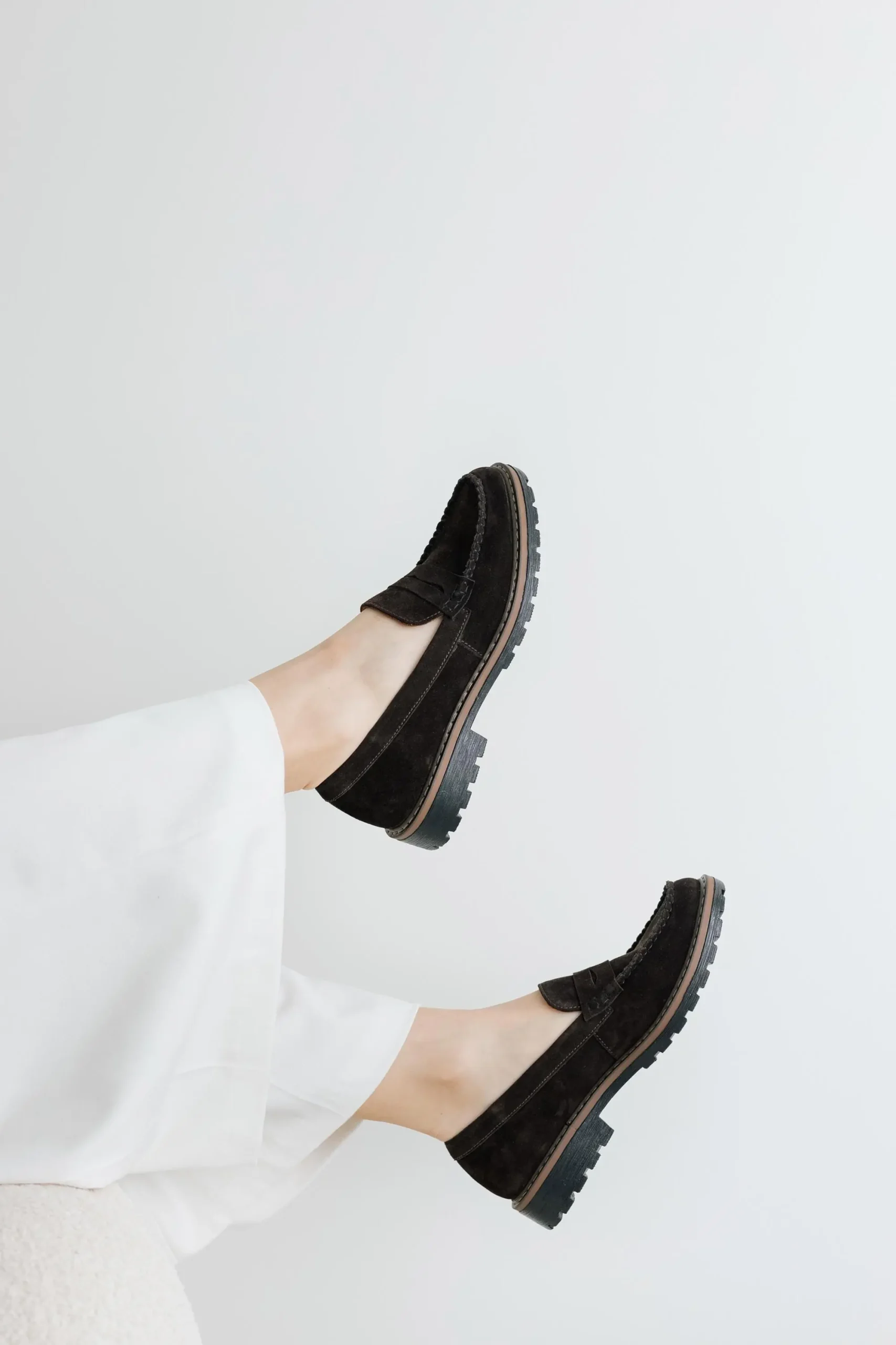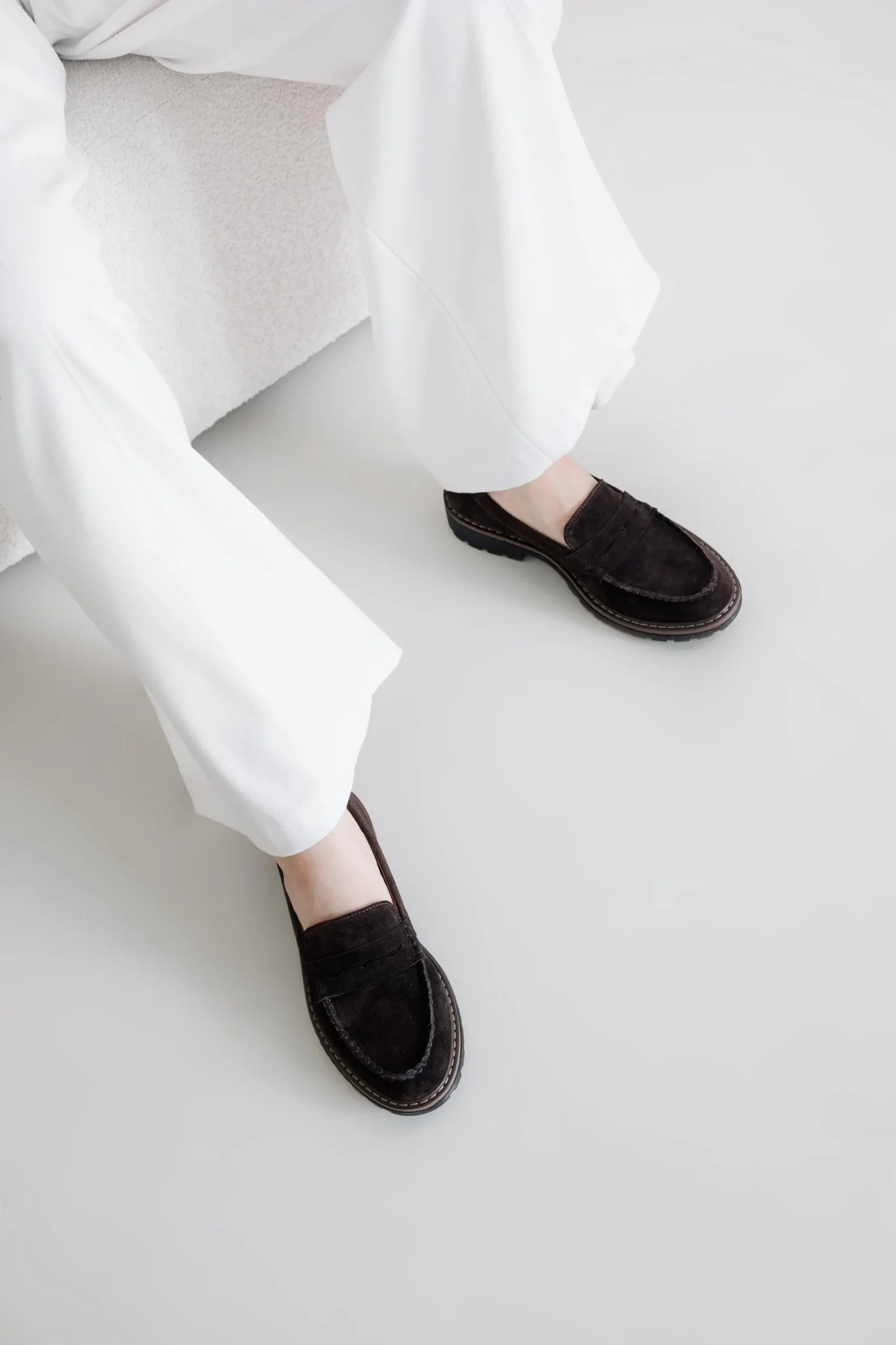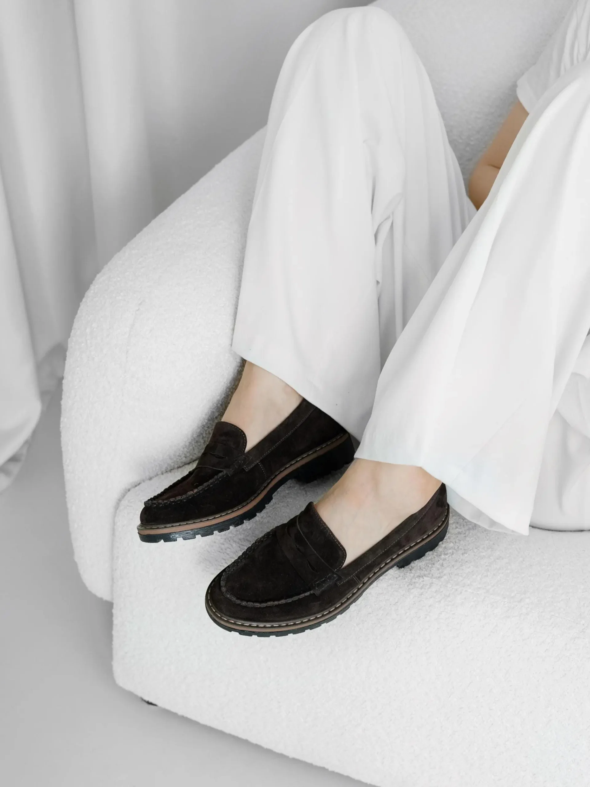 Discover timeless elegance and modern comfort with our Women’s Suede Penny Loafers in Dark Brown. Handcrafted from premium velour suede, these loafers feature a rich, deep brown color that pairs perfectly with any outfit — from casual denim to tailored trousers. The design is enhanced by a chunky, durable sole with a contrasting stitch detail, adding a contemporary edge to the classic penny loafer silhouette. The soft suede upper and comfortable insole ensure maximum comfort throughout the day, while the rugged sole provides excellent grip and stability. Key features: 1. Handcrafted in our workshop in Kyiv.